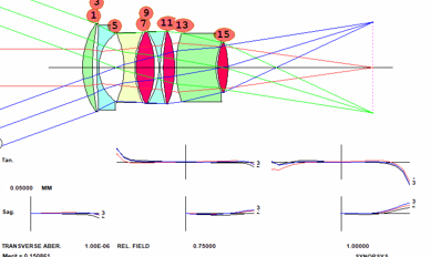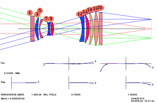 做定焦结构时,只需要在 DSEARCH 中输入目标参数,软件就会从平行平板开始,赋予每个元件正负光焦度,进行搜索+优化,此过程会将所有镜头组合都经历一遍,最后给出评价函数最小的10个最有潜力的结构。做变焦结构时,需要 ZSEARCH 输入中指定前固定组、变焦组、补偿组、后固定组。而且由于 SYNOPSYS 使用的是伪二阶导数算法,它的速度特别快,从7个平行平板设计到像质OK的7片式透镜,用时不到2秒种就可以完成。