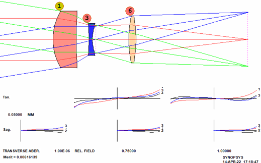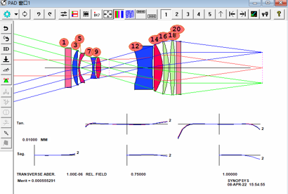 SYNOPSYS还有一个很神奇的功能,它可以自动修正光线追迹失败并优化。也就是说如果镜头中有光线出现问题,那么顶部工作栏里的Fix Ray Failure按钮就会变亮,一直点击按钮直到熄灭就表示光线被自动修正了,给我们设计镜头带来了方便。