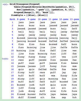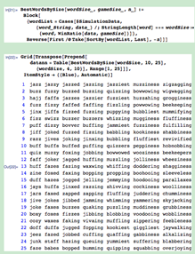 我们现在可以改进我们的选词算法。我们不应该随机选择一个词,而应该将我们的选择权重放在具有高胜率的词上。 当然,这只是朝着纳什均衡点又走了一步。如果猜测者更新算法以考虑到该策略,我们将不得不重复这整个实验,以获得一个更好的策略。最终,这两种算法很可能会收敛在一个点上,即每个词都有相同的胜率,而我们将知道最佳的游戏结果。 我怀疑这 13 局游戏基本上是可以解决的。有足够多的词是很容易猜到的,在这些词上冒更大的风险,去测试更难的词,会使猜测算法从 99% 的成功率提高到 100%。在这一点上,我们处于平衡状态--用 WOPR 的话说,"一个奇怪的游戏。唯一的胜利之举就是不玩。《战争游戏》的提法特别相关,因为纳什均衡被用作冷战时期相互确保破坏的核战略的理论基础,而影片的高潮基本上是这种模拟--增加了计算机的自我意识)。 对于 10 局,我只学到了足够的知识,看到最终的算法可能相当复杂,而且在这个简单的游戏中,有比我预期更丰富的内容。 如果您更想获得乐趣,那就从长词中挑选最好的。这里有一个表格,列出了10局中每个长度的最佳单词。它们的表现不如 3-5 个字母的单词好,但在娱乐方面,您无法击败 "powwowing"、"bowwowing "和 "huzzahing"! 这都是基于 Mathematica 内置的 90,000 词英语词典。对于更大的字典或其他语言,结果可能会有很大不同。